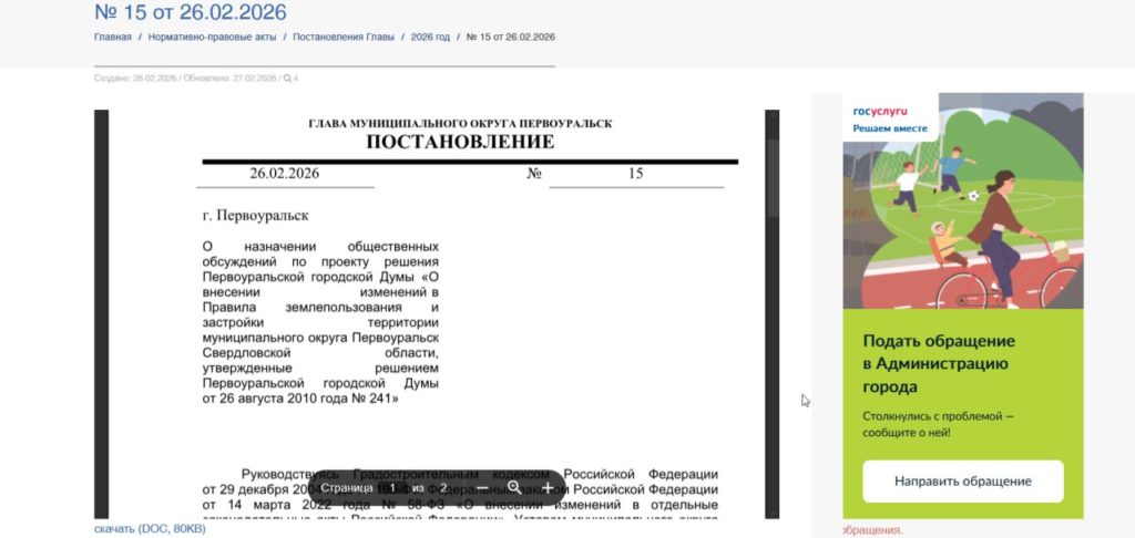 Опубликовано постановление Главы Первоуральского ГО о проведении публичных обсуждений с 3 по 10 мартаизменений ПЗ иЗ в части территории поселка Оникс